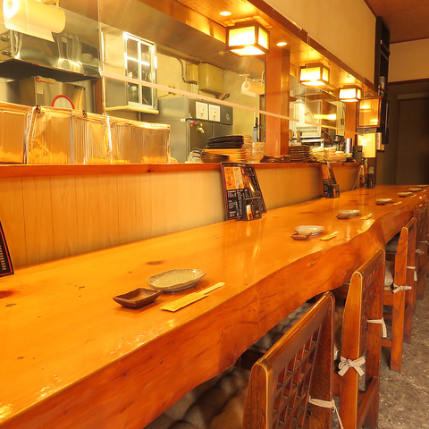 【広々したカウンター】カウンターはおひとり様でもお気軽にご利用いただけます。広々としたカウンターは1枚板を使用しているので雰囲気バツグン。カウンターならではの雰囲気を感じていただいたり、スタッフとお話ししたり、一人でくつろいだり…。人と人の繋がりを大切にするお店です☆