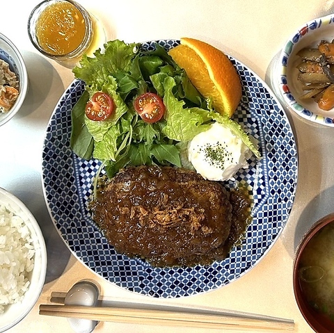 ジューシーなハンバーグに、デミグラスソースか和風オニオンソースをお選びいただけます ポテトサラダ 小鉢2種、ごはん、味噌汁