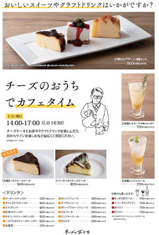 - 【チーズのおうちでカフェタイム】※土日祝日 14:00~17:00(L.O16:30)