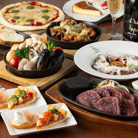 お腹が膨れないように、小さなメニューを多彩に楽しめる本コース。メインは当店自慢の牛サガリステーキ!さらにアヒージョ、マルゲリータも食べられる、バリエーション豊かなラインナップ♪そしてドリンクは100種類以上が飲み放題!食べて飲んで、いろいろな味をお楽しみください。