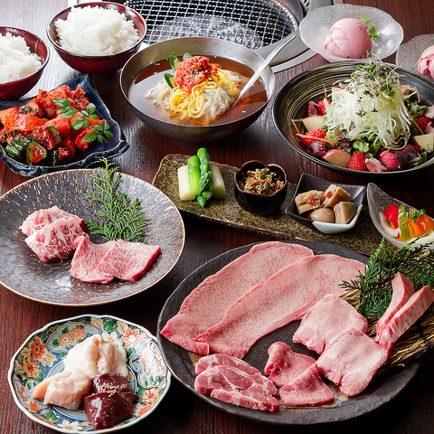 牛タン盛りをはじめこだわりの韓国前菜や副菜が味わえる全10種。4,400円税込。飲み放題付きは6050円税込~