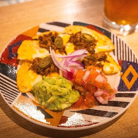 クリスピーなコーントルティーヤに馬車道タップルームのスモークミート、チーズ、ハラペーニョをトッピング。自家製ピコ・デ・ガロとワカモレを添えて