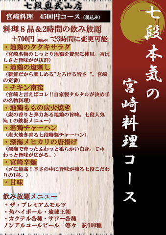 宮崎の旨いをとことん味わう、七段自慢の本気の宮崎料理コース。新鮮な地鶏を使用した「地鶏のタタキサラダ」「地鶏の塩刺し」をはじめ、宮崎名物チキン南蛮、香ばしく焼き上げた地鶏ももの炭火焼き、旨みたっぷりの若鶏チャーハンまで、全8品の充実内容。