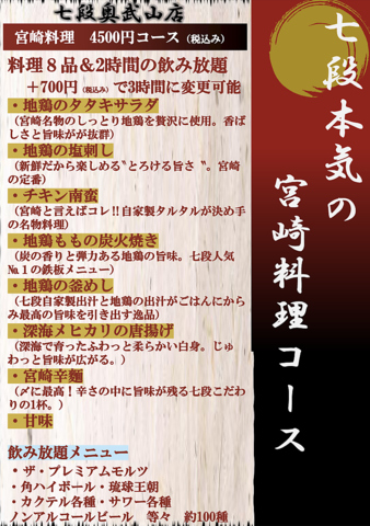 宮崎の旨いをとことん味わう、七段自慢の本気の宮崎料理コース。新鮮な地鶏を使用した「地鶏のタタキサラダ」「地鶏の塩刺し」をはじめ、宮崎名物チキン南蛮、香ばしく焼き上げた地鶏ももの炭火焼き、旨みたっぷりの地鶏釜めしまで、全8品の充実内容。