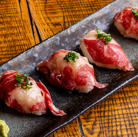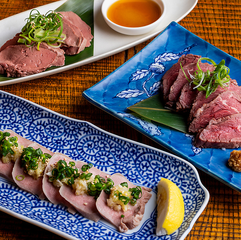和牛レバー、ハラミ、タンの肉刺しは絶品です。低温調理しているのでお肉の旨味が凝縮しております。