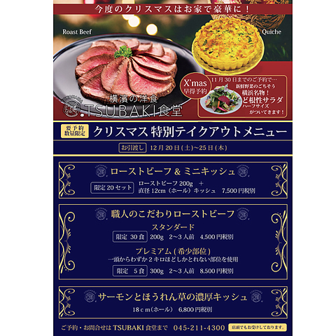 今年のクリスマスはお家で豪華に!!TSUBAKI食堂のクリスマス特別テイクアウトメニューで彩りください。