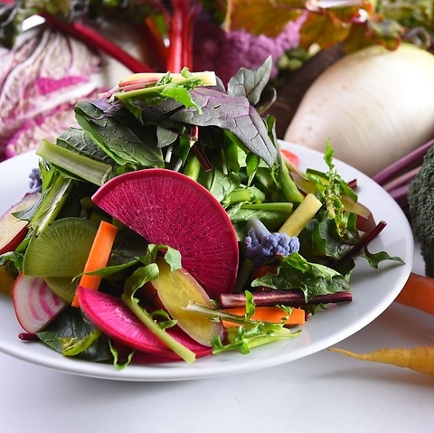 新鮮なお野菜が自慢の当店。生産者のお顔がわかる食材にこだわっているため安心してお召し上がりいただけます。丁寧に育てられた野菜は味の濃さが特徴で食べた瞬間口いっぱいにおいしさが広がります。