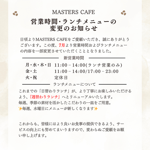 マスターズカフェ MASTERS CAFE ランチ 2025/06/23 更新