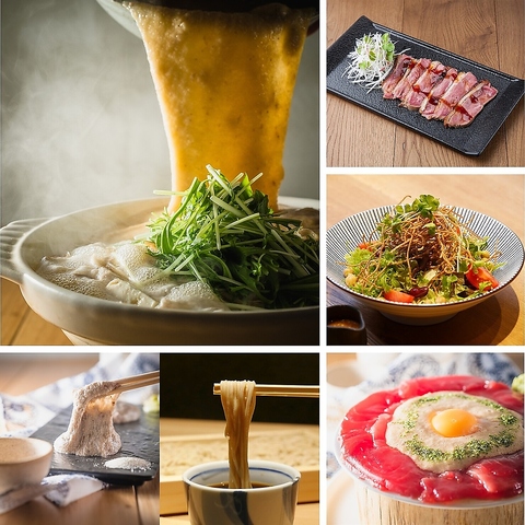 当店名物の「自然薯とろろもつ鍋」。皮ごとすりおろした自然薯とろろをふんだんにそそぎこみ、プリっとした国産牛モツのくせになる食感と滲みだす旨味に、やさしい一番出汁の香りが堪らない「自然薯鍋」。〆のつけ蕎麦が絶品です!宴会、女子会、デートなどにおすすめです!国産もつ、鹿児島県産黒豚、国産とりの3種類♪