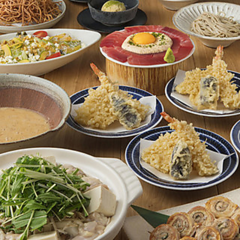 <1/1~>じねんじょ庵おすすめ料理を一通り体験できるコースです。蕎麦屋ならではの前菜五種、骨付き揚げ鶏、天ぷらなど、お店の定番メニューが気軽に楽しめる、〆には囲み蕎麦で♪※ごゆっくりとお席は2時間30分(当日状況により延長も可能)※飲み放題は、2時間飲み放題が付きます。(LO30分前)※飲み放題延長 60分500円プランも有(当日ご予約状況によりご相談下さい)