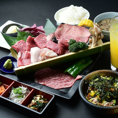 ◇前菜4種盛 ◇厚切り上タンステーキ ◇和牛カルビ ◇和牛上カルビ ◇肉厚ハラミ ◇焼しゃぶ ◇厳選赤身肉 ◇日替わり希少部位4種 ◇焼き野菜 ◇白ごはん(おかわり自由) ◇牛骨スープ(おかわり自由) ◇厳選ティードリンクバー(平日(土・日・祝を除く)のみ) ※内容は一例です。日替わりメニューにてご提供いたします。