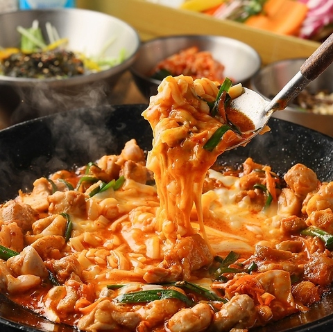 韓国料理の王道★とろ~りチーズと熱々お肉のチーズタッカルビとの相性も抜群!通いたくなる絶品料理の数々です♪お料理・お酒ともに韓国気分を心ゆくまでご堪能ください!【梅田#韓国#個室#チーズタッカルビ#誕生日#肉#食べ飲み放題#サムギョプサル#肉寿司#ユッケ寿司#鍋#もつ鍋#焼肉#チーズ】