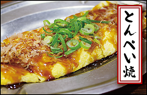 レバーカツ290円(税込)/たいのかぶと煮850円(税込) /とんぺい焼600円(税込)/手仕込み!あじフライ550円(税込)/豚の超にんにくステーキ1050円(税込)(※お写真はとんぺい焼)