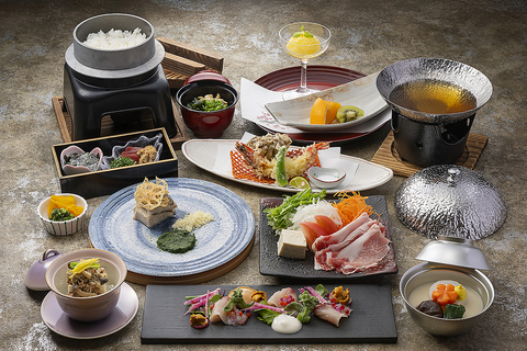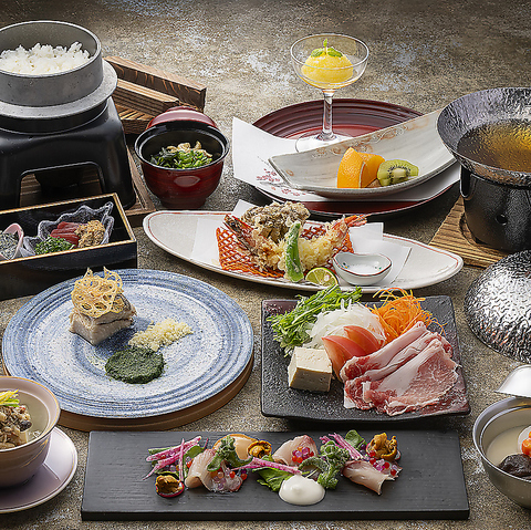 期間:12月1日(月)~2026年2月28日(土) ディナータイム 17:00~20:30 (※ラストオーダーは終了時間の1時間前) お品書き ・先付け サーモン白板昆布〆 ・御椀 名残り鱧 ・向付 紅葉鯛、針烏賊、〆鯖焼き霜 ・台の物 陶板焼き ・蓋物 吉次蕪蒸し ・揚げ物 阿波牛ロース香味揚げ ・食 事 きのこの炊き込みご飯、香の物、留椀 ・水菓子 梨、シャインマスカット、柿のゼリー (全8品)