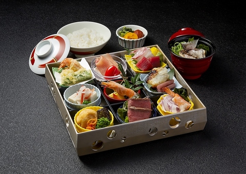 ランチ限定!お料理を詰め込んだ御膳をご用意しました。味は勿論見た目でもお愉しみ頂けます。ディナー限定の藍彩 旬彩箱にはお寿司などもついております♪(6800円(税サ込))※写真はイメージです。