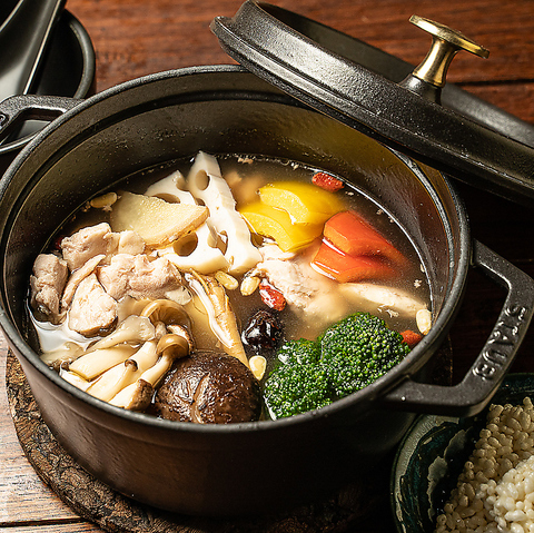 西洋料理の技法を使用して高麗人参や漢方などと鶏ガラを12時間じっくり煮込んだスープで岩手県産菜彩鶏を軽く煮込みました。薬膳のベースとなる5色(青・赤・黄・白・黒)の野菜がバランスよく盛り込まれ、食欲をそそります。鶏肉 高麗人参 大棗 枸杞の実 松の実 冬虫夏草 竜眼肉 はと麦 陳皮、、、ハーフサイズ 2420円(税込)