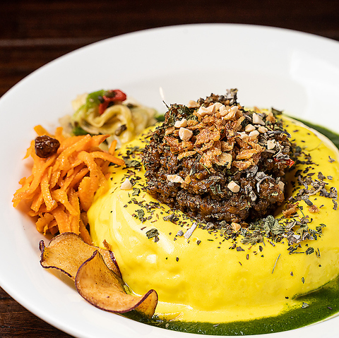 お砂糖の代わりに生薬を用いるなど、約25種類の生薬・スパイスを使用した味わい深い一品。モルネーソース(ベシャメルチーズソース)がまろやかに合います。合いびき肉と香味野菜たっぷりのカレーに合わせるのは、オーナーの地元・岩手県産の特別栽培米「ひとめぼれ」です。