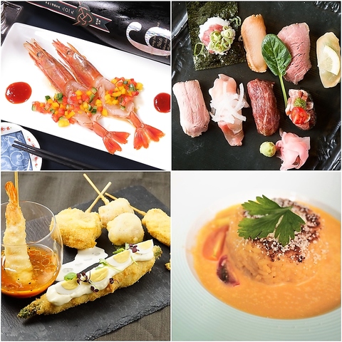 料理人が研究試作を重ねオリジナリティを加えた当店でしか出会えない【和食・イタリアン・スパイス料理・中華・韓国料理】など世界各国料理の食のコラボレーション!流行りの【肉寿司・野菜肉巻き・洋風創作天ぷら串】や、お酒のお供や肉料理・魚料理・サラダ・アヒージョ・ピザ・パスタなどの定番料理の数々も!お料理メニューは100種以上!