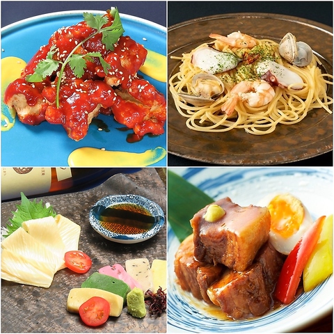 多数の料理店で修業を積んだ職人が試作研究を重ねた、多彩な独創的創作料理の数の々は、盛付けにもこだわりSNS映えも♪日本/イタリア/韓国/中国/スペイン/東南アジアなど『世界各国料理のマリアージュ』他、安心の定番料理・肴にヤンニョムチキンなど流行りメニューも充実!お料理130種!230種のドリンクとのマリアージュ♪