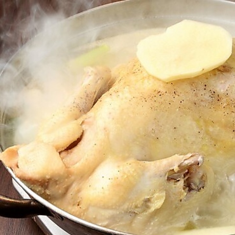 国産の錦爽鶏を使ったコラーゲンたっぷりのタッカンマリです。錦爽鶏は煮込めば煮込むほどお肉が柔らかくなり、ほろほろと骨から剥がれていきます。下処理は中を丁寧に洗い、じっくり時間をかけて火を通していきます。わずかな調味料だけで煮込み、肉の旨味とたっぷりのコラーゲンが染み出た透き通ったスープです。