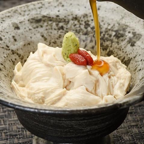 京都の名産生湯葉はトロっととろける食感が魅力です。栄寿庵特製の醤油ベースの《べっこう餡》をかけてどうぞ。
