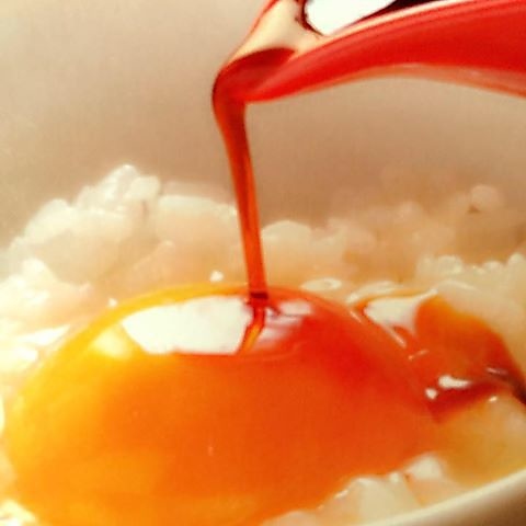 アツアツご飯に黄身の色が濃い、その名も濃紅たまご!自家製の出汁醤油でお召し上がりください。