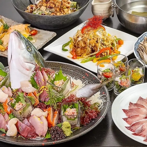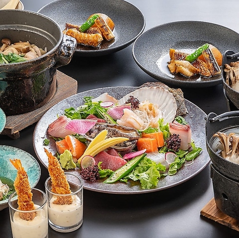 会席プランの1つ「お造りコース」。刺身大皿盛りや海鮮小鍋など、新鮮な魚介をたっぷりと味わえる魚尽くしのラインナップ!煮物や先附も魚料理です♪肉より魚派という皆様必見の内容となっております。魚の旨味活きる多彩な海鮮料理をお楽しみください。