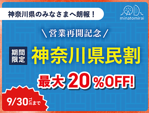 神奈川県在住の皆様に感謝の気持ちを込めて、特別なご優待をご用意しました。【対象】神奈川県在住の方※公的証明書(運転免許証・保険証等)のご提示が必要です。【通常入館料】大人1名様 3,500円【優待内容】・平日:20%割引 → 2,800円・土日祝:15%割引 → 2,975円・小学生:1,800円 → 1,700円