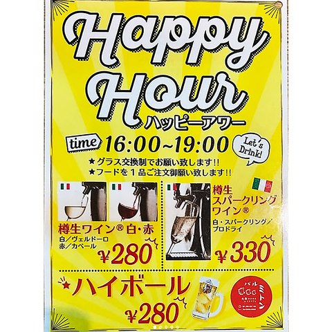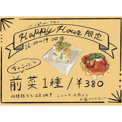 ハッピーアワー限定でお得な前菜ご用意しております!詳しくは店員まで