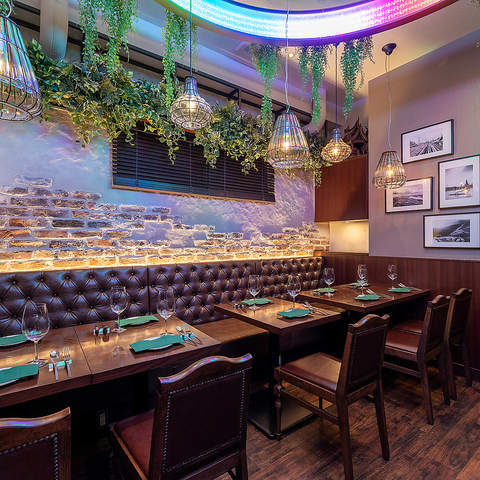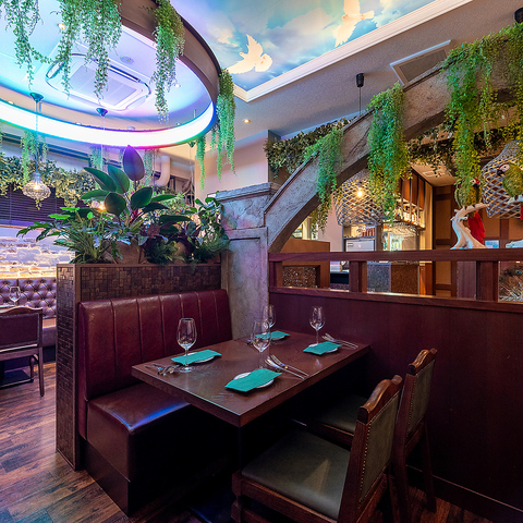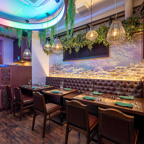 グリーンを配した爽やかな空間はデートや女子会に人気。アジアンリゾートのような雰囲気を楽しめます。