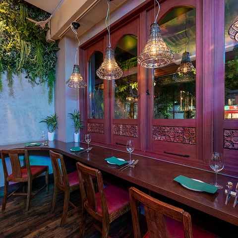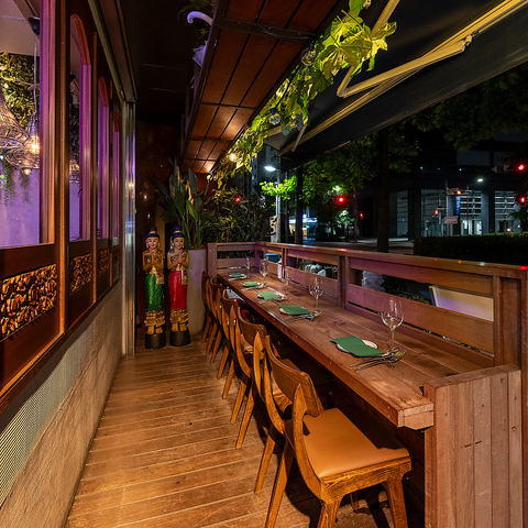 ウッドデッキのテラス席にはグリーンがあふれ、天気の良い日はリゾート地のような開放感を味わえます。店内には気軽にタイ料理を楽しめるカウンター席や、ゆったり過ごせる広めのテーブル席も完備。自然光と照明が調和した写真映えする空間で、大切な日のお食事から普段のディナーまで幅広くご利用いただけます。