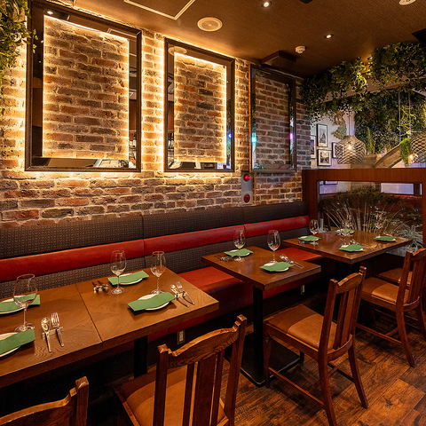 少人数でのご利用にも心地よく過ごせるよう、店内にはほどよい距離感のテーブル席が配置され、落ち着いた時間を楽しめる空間になっています。豊富なグリーンと暖かな灯りが作り出す柔らかな雰囲気は、デートや女子会、ちょっとしたカジュアル利用にもおすすめ。