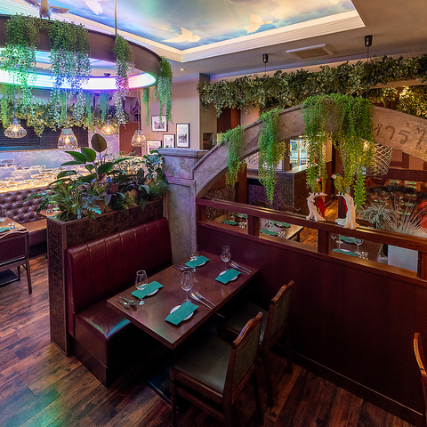 SAWAN銀座店の店内は、豊かなグリーンと柔らかな照明が織り成す心地よいリゾート空間が魅力です。雰囲気あるテーブル席はグループでの利用にも最適で、職場のご宴会やご友人同士の集まりにも幅広く対応できます。エキゾチックな装飾と温かみのある木の質感が調和し、特別感のある時間を演出。