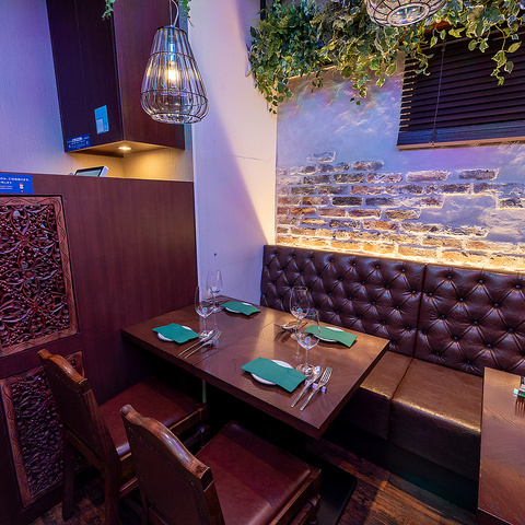 4名様向けのテーブル席は、ママ会や女子会、友人同士のお食事など幅広いシーンにおすすめです。店内の落ち着いた照明とアジアンリゾートの雰囲気が心地よく、ゆったり過ごせる空間です。