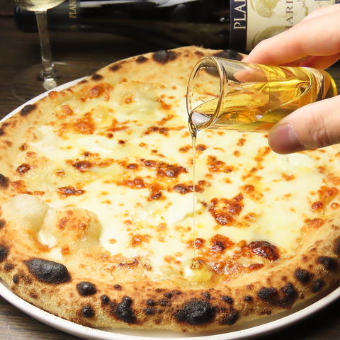 濃厚な4種のチーズを贅沢に使った自家製クアトロフォルマッジ。モッツァレラのとろける食感、ゴルゴンゾーラの深い香り、パルミジャーノの旨味、カマンベールのまろやかさが絶妙に調和。仕上げのはちみつで甘じょっぱい至福の一枚に。