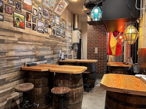 店内のお席。樽をイメージしたテーブル席でお食事をお楽しみ下さい!!