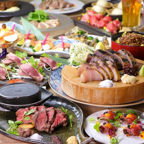 【接待や会社宴会など各種ご宴会に】低温でじっくり寝かせ旨味が増した【30日間熟成赤身肉の藁焼き】をご賞味ください♪他にも「スダチ鶏の藁焼きタタキ~柚子胡椒~」「鰹と旬魚の藁焼き」や「アナゴと旬野菜の天婦羅」など自慢の藁焼きをご堪能頂ける全10品をご用意!日~木3時間/金・土・祝前日2時間飲み放題付!※L.O.30分前