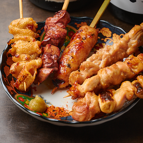 備長炭を使用し熟練の技でじっくり丁寧に焼き上げた本格炭火串焼き。鶏の皮はパリッと中はジューシーに、レバーはとろける甘さを活かすように、部位ごとに絶妙な火加減で焼き上げております。自慢の生つくねもお客様の美味しいの笑顔のために生み出した珠玉の一品!ぜひご賞味ください!