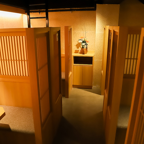 モダンな雰囲気も取り入れた和風個室。柔らかい照明が安らぎの空間を演出します。是非当店で楽しい時間をお過ごしください♪接待や女子会、合コンにも人気です◎