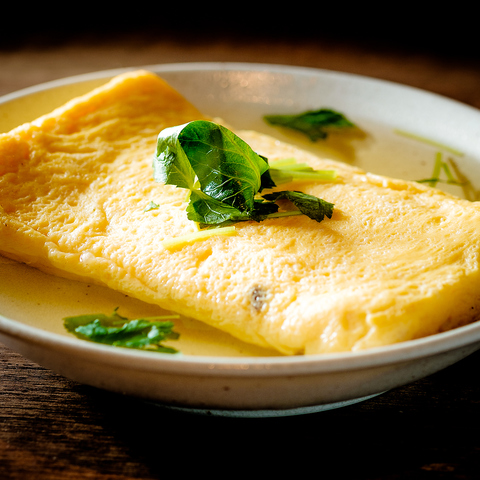 リピート率NO1!! 【明石焼き風だし巻き玉子】掌サイズのフワトロ玉子がタップリ出汁に浸っています。