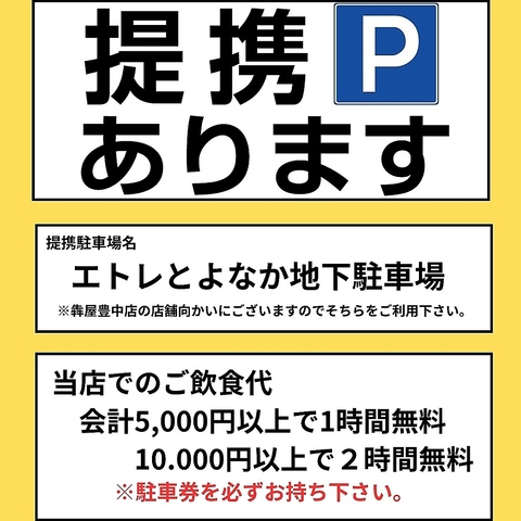 | 駐車場 | あり :10000円(税抜)以上のご飲食の方に限り2h無料(提供駐車場はエトレ豊中駐車場)) |