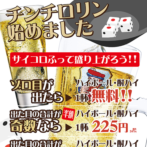ハイボール・酎ハイがチンチロリンでメガか半額、ゾロ目なら無料!運試しにサイコロを振って盛り上がろう!