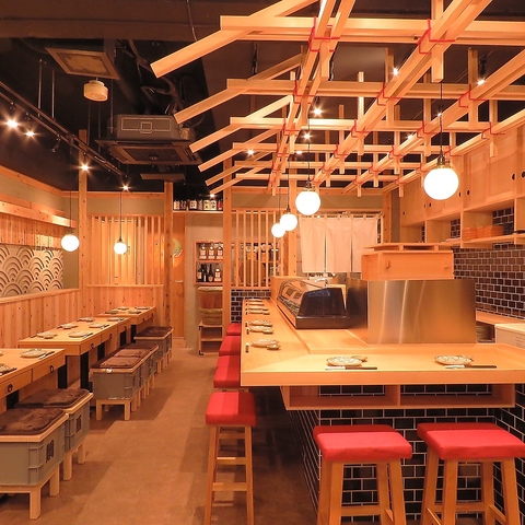 デートにも、飲み会にもピッタリ!!雰囲気自慢の店内です!!肩ひじ張らない寿司酒場の空気感。友人との飲み会や仕事帰りにも使いやすい、温もりある空間。気軽に座れるテーブルは、女子会や友人とのカジュアルな飲み会にもぴったり。