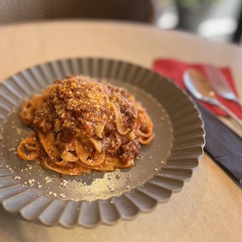 少し幅広のタリアテッレは生パスタ。粗挽き肉をしっかりと焼き赤ワインをたっぷり吸わせ香味野菜と美味しいトマトソースで煮込んだミートソース。