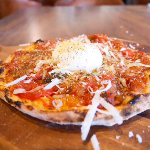 薪窯の高火力で一気に焼き上げるピザは、外はパリッと香ばしく、中はもっちり♪香り立つ生地が食欲をそそります!定番のマルゲリータやフレッシュトマトのピザ、半熟卵がとろけるビスマルク、濃厚なクワトロフォルマッジまで、こだわりの5種をご用意。他では味わえない贅沢な一枚をぜひご堪能ください!