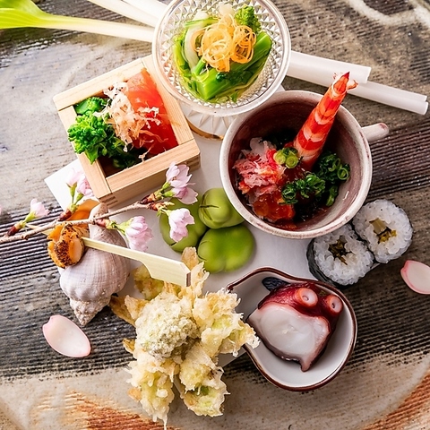 “ 春 夏 秋 冬 ” 季節の移ろいを愛でる料理人が奏でる会席コース。四季の巡りを感じ、五感で悦喜できるお料理は、ほんの一瞬だけ鮮烈に輝きを放つ美味しさの頂点を迎えた旬の味。会席コースでは、ひとつの物語を感じ取ることができる。