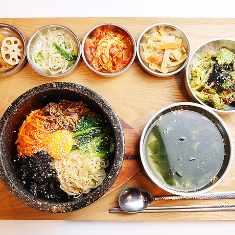 ランチ営業は11時より!一番人気★石焼ビビンバ♪おかず4品,スープ付きで850円!ランチ限定 ★生サムギョプサルセット(おかず4品、ネギサラダ、サンチュ、スープ、焼きキムチ、のり巻き、ライス付き)1600円!ランチ限定★参鶏湯半身1100円!(ご飯お代わり無料) 他20種類の韓国ランチメニューが揃っております!