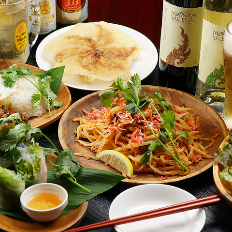 ☆2時間飲み放題と食事付きコース☆1.アジアンタパス4種盛り2.焼餃子3.青菜炒め4.エビマヨ5.麻婆豆腐6.パッタイ7.ガパオライス
