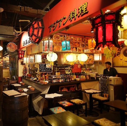 たべもの横丁内にあるアジアン料理店。心惹きつけられるアジアン風の装飾や行燈に囲まれ、熱々の鉄板料理が目の前で調理されるライブ感をお楽しみいただけます!気の置けない仲間と共に、異国情緒あふれる雰囲気の中で、ゆったりとしたひとときをお過ごしください♪