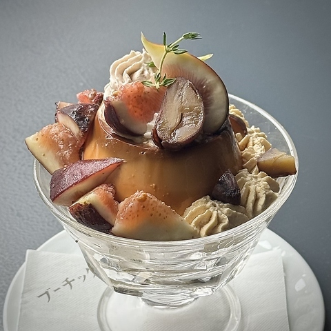 秋の味覚無花果と栗にBOOCHiC自慢のプリン無花果シャンティ、キャラメルシャンティ、ミルクムース、バニラアイス、無花果ソースなどパフェのようなプリンアラモードです